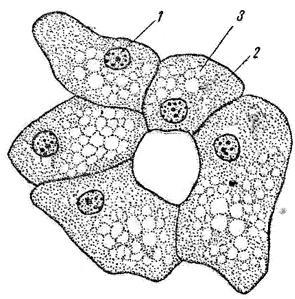 Препарат № 1. Клетки печени аксолотля (рис. 1) Данный препарат, а также препараты № 2 и 3 рассматриваются для изучения различной формы клеток, Кусочек печени аксолотля фиксируют смесью Ценкера, Буэна или 10%-ным формалином. Заливают в парафин и делают срезы толщиной 4-5 р,. Окрашивают квасцовым гематоксилином и эозином. При малом увеличении микроскопа видно, что основу препарата составляют крупные многоугольные печеночные клетки. Они резко отграничены друг от друга и содержат относительно маленькие круглые ядра1.Препарат следует рассмотреть при большом увеличении. Протоплазма клетки имеет зернистую или сетчатую структуру и окрашена эозином в розовый цвет, В ней видны бесцветные вакуоли, которые получаются в результате растворения фиксатором жира, находящегося в клетках печени в большом количестве. Почти в центре клетки лежит округлое ядро. Внутри ядра можно различить зерна и глыбки вещества, интенсивно окрашивающегося гематоксилином в фиолетовый цвет и называемого хроматином. Среди зерен хроматина расположены одно или, реже, два круглых ядрышка, окрашенные эозином в розовый цвет. Нередко встречаются клетки с двумя ядрами. На препарате, кроме клеток печени, могут встречаться еще скопления темно-коричневых отростчатых пигментных клеток.