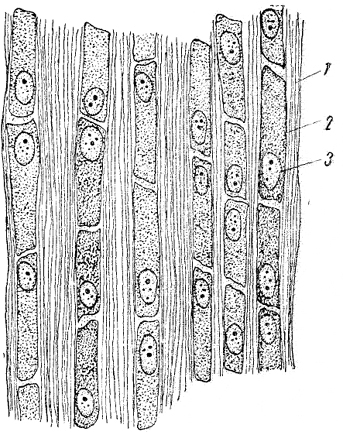 1 - пучки коллагеиовых волокон, 2 - сухожильные клетки, 3 - ядра сухожильных клеток 141 параллелограммов, трапеций, иногда треугольников. Округлые светлые ядра часто лежат в двух соседних клетках одно около другого. По-видимому, такое расположение ядер является следствием амитотического деления сухожильных клеток. Ряды сухожильных клеток отграничивают сухожильные пучки первого порядка. Кое-где на продольном срезе сухожилия можно заметить тонкие тяжи волокнистой соединительной ткани, окружающей группу пучков первого порядка и таким образом отделяющей пучок второго порядка. Яснее соотношение соединительной ткани и коллагеновых пучков сухожилия будет видно на следующем препарате. Большое количество и плотное расположение коллагеновых пучков в сухожилии характерно для ткани, выполняющей механическую функцию. 142 |