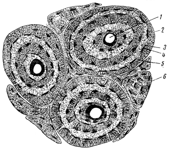 1-гаверсов канал, 2-гаверсова система, 3 - костные пластинки, 4- костные полости, 5 -отростки костных полостей, 6- вставочные участки вещество кости построено из тонких костных пластинок, являющихся основными архитектурными единицами костной ткани. Поэтому на срезе кость имеет слоистый вид. Снаружи и отчасти изнутри кость покрыта общими, или генеральными пластинками, располагающимися параллельно ее поверхности. Количество генеральных пластинок и, соответственно, толщина образуемого ими слоя в разных костях могут быть различными. Иногда с наружной стороны кости видны обрывки ткани, это остатки надкостницы (периоста), плотно прилегающей к кости и состоящей из неоформленной плотной соединительной ткани, 156 С внутренней стороны, примыкающей к костномозговой полости, часто заметны обрывки волокнистой оболочки (эндоста), выстилающей костномозговую полость, и костного мозга, который всегда можно узнать по наличию жировых клеток. Расположение костных пластинок в остальной кости тесно связано с распределением в ней кровеносных сосудов. В диафизе трубчатой кости многочисленные сосуды идут главным образом по длине кости; они располагаются в так называемых гаверсовых каналах, пронизывающих плотное основное промежуточное вещество. На поперечном срезе каналы имеют вид кружков или, если срез прошел косо, овалов. Тонкие, разветвляющиеся и анастомозирующие между собой каналы пробегают главным образом параллельно длинной оси кости. Соединения между продольными каналами имеют несколько меньший диаметр. На поперечном срезе эти боковые ответвления обычно не видны; их следует изучать на продольном срезе кости (см. препарат № 93). В гаверсовых каналах проходят питающие кость кровеносные сосуды, сопровождаемые небольшим количеством соединительной ткани, и нервы. При декальцинации кости сосуды и нервы, как правило, разрушаются, и каналы обычно оказываются пустыми или же в них видны только зернистые остатки ткани. Сосуды проникают в костное вещество либо со стороны надкостницы, либо из костномозговой полости, через широкие фолькмановские каналы, прободающие генеральные пластинки. Эти каналы входят в кость под прямым или острым углом, следовательно на препарате срезаны вдоль. Фолькмановские каналы не окружены системами костных пластинок (см. ниже) и поэтому хорошо отличимы от гаверсовых. Очень скоро после вхождения в кость они изгибаются, располагаются по длине кости, вокруг них образуются системы костных пластинок, т. е. они превращаются в гаверсовы каналы. Если кость взята от молодого животного, то на препарате встречаются довольно большие полости неправильной формы, так называемые гаверсовы пространства. Они обычно содержат остатки разрушенной при изготовлении препаратов соединительной ткани с сосудами. Костные пластинки располагаются вокруг гаверсовых каналов совершенно закономерно; они концентрически наслаиваются друг на друга таким образом, что в результате образуется система, состоящая из вставленных друг в друга цилиндров. Вследствие этого получается длинная трубка с толстой стенкой, состоящей из плотно спаянных между собой костных пластинок, и узким просветом - гаверсовым каналом. Все это образование называется гаверсовой системой. Каждая гаверсова система отделена от окружающих частей ясно видимой спайной линией. 157